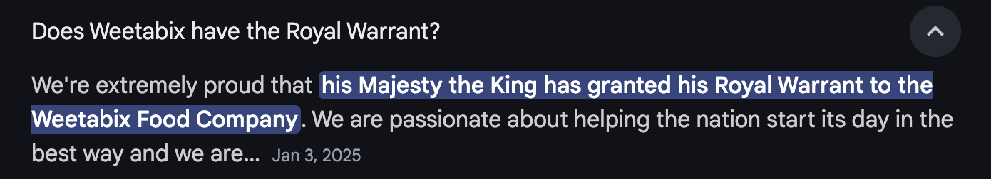 It’s what they give to what they use. Oh look, the King just gave the Royal Warrant to Weetabix! You’ve gotta try weetabix for breakfast while you’re there, haha. (I did have that, too.) (It was available in the cafeterias!)
