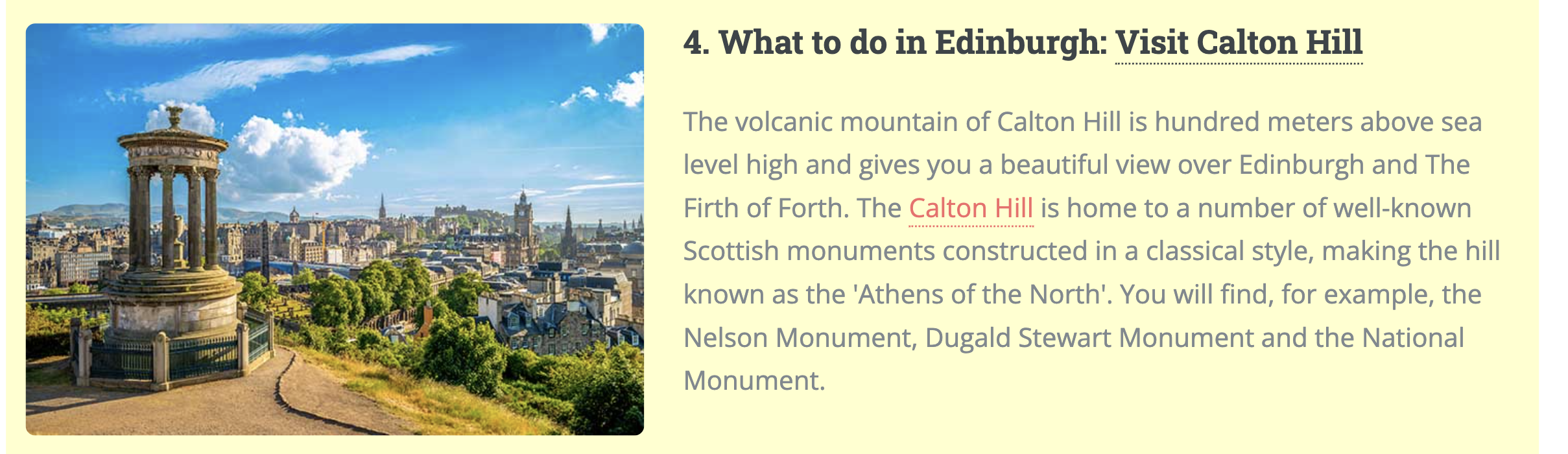 Calton Hill you should also go to. I remember going with one of my classes. We got a tour though I don’t know how you’ll do that, and how interesting it’ll be without it. But it’s clearly still quite recommended and you should go. It has beautiful views of the city. Here’s a picture: