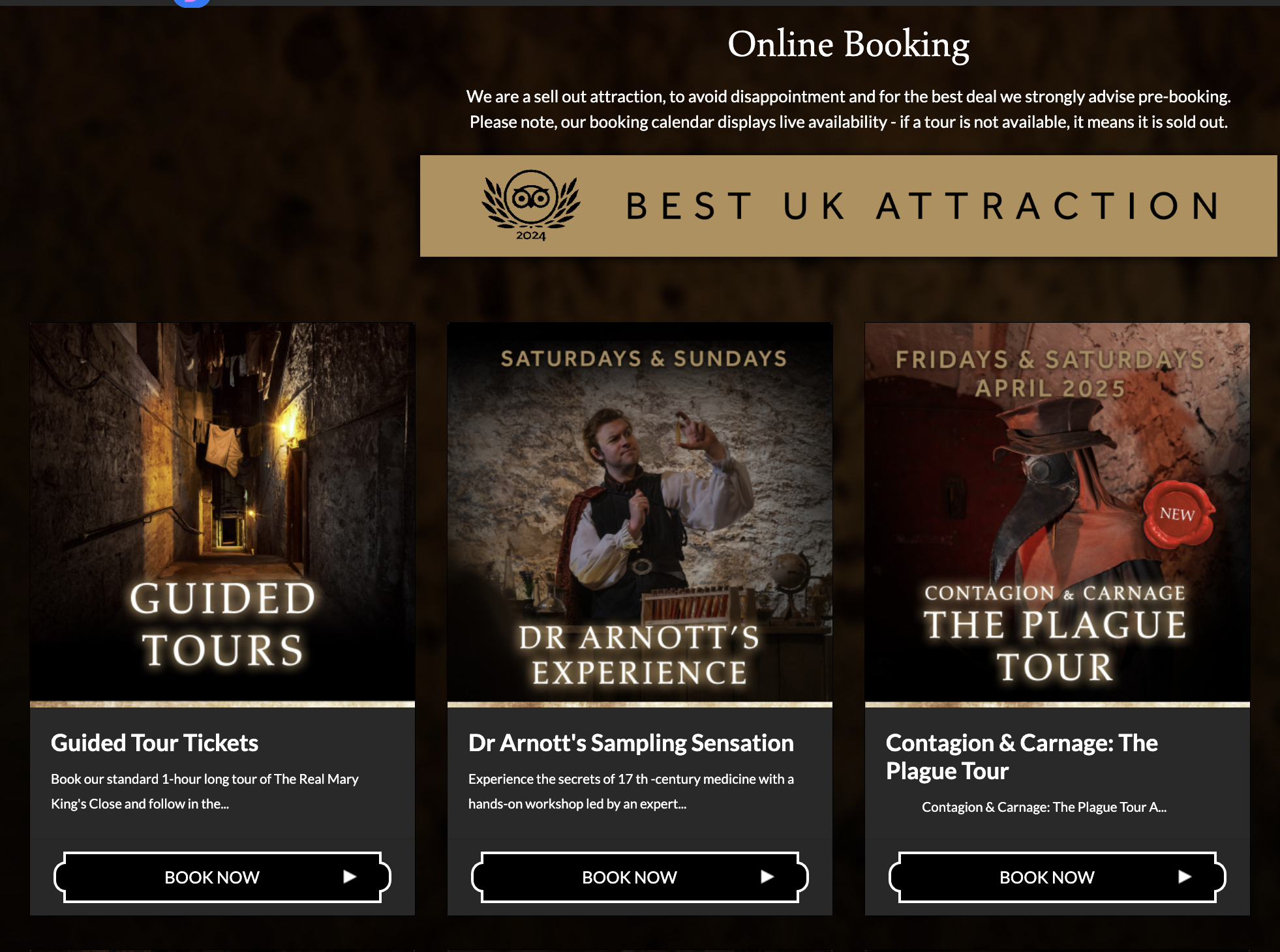 Here’s the link to it. It’s not a place I went, but I’m inferring that it’s pretty great. Plan your Visit - The Real Mary King’s Close You’ve got to pre-book online too if you want to go. It says it sells out.
